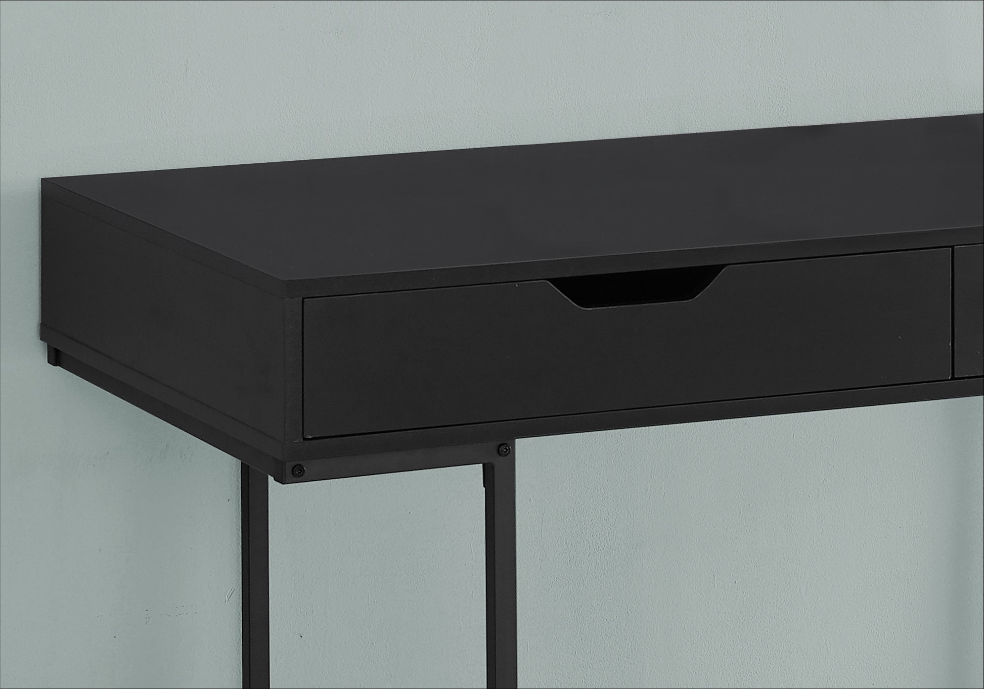 - Bureau d'ordinateur au fini noir avec 2 tiroirs de rangement dotés de larges poignées découpées et de glissières de tiroir en métal