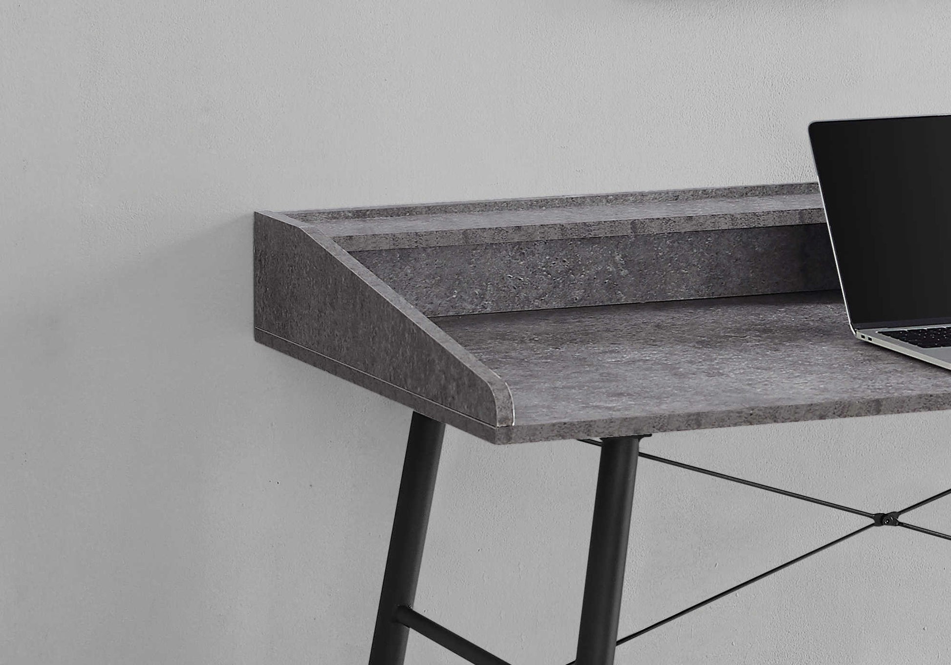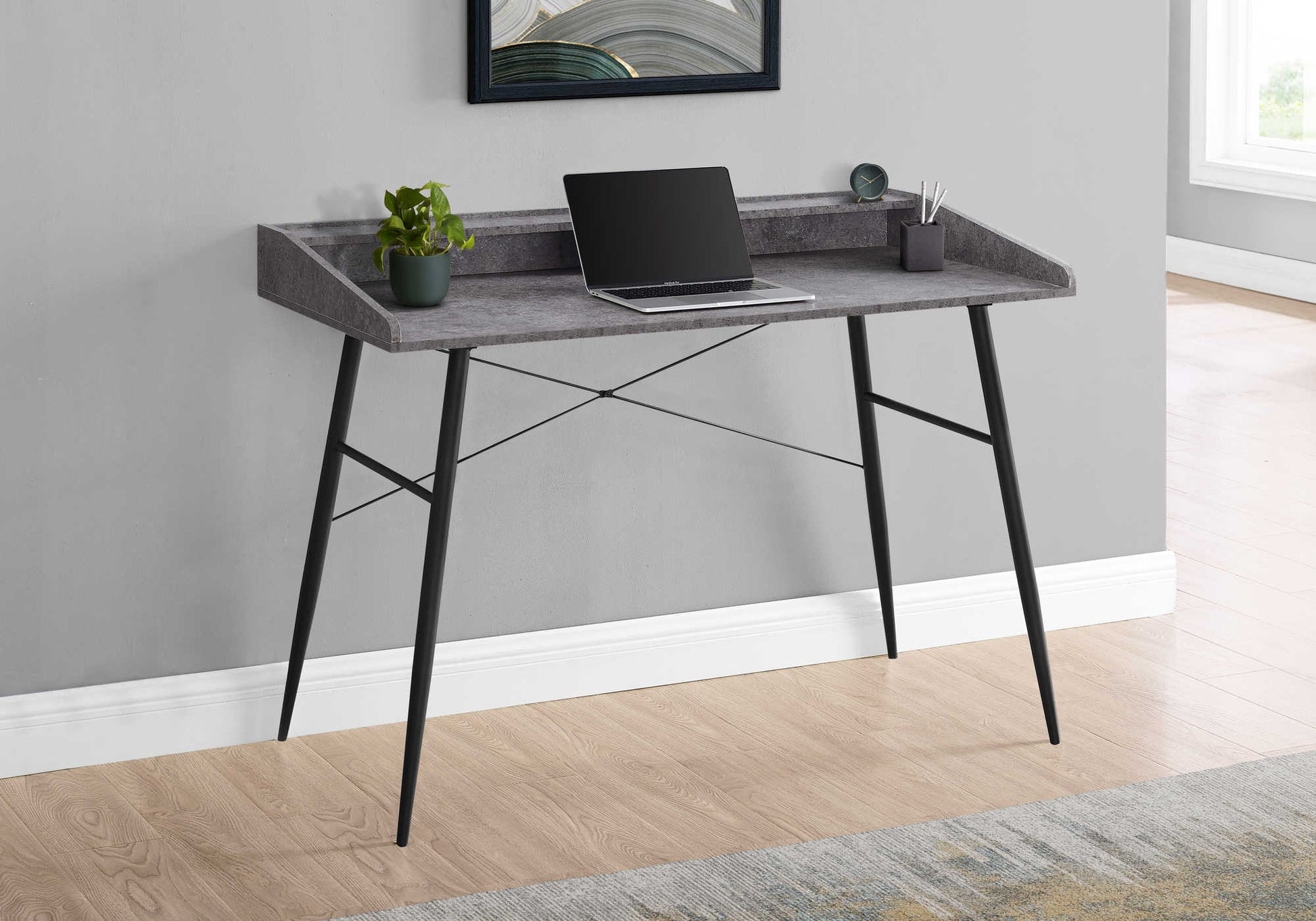 Ce bureau d'ordinateur avec huche au fini d'aspect pierre grise fera passer votre bureau à domicile au niveau supérieur. Les côtés du bureau s'élèvent graduellement pour rencontrer le clapier pour un look élégant. Le dessus de la huche sert également d'étagère, tandis que l'espace en dessous est divisé en 2 compartiments de rangement où vous pouvez ranger de petits objets et garder votre surface de travail organisée. Offrant soutien et stabilité, une base en métal au fini noir et présentant des détails de conception saisissants, tels que des pieds en métal effilés et des barres de support en forme de X élancées. Cet ordinateur portable ou table d'écriture a un design compact et un style moderne du milieu du siècle qui est un excellent choix si vous utilisez votre salon ou votre chambre comme bureau à domicile.