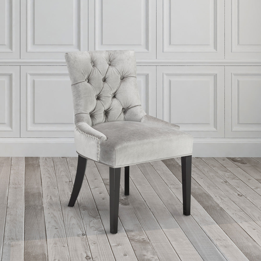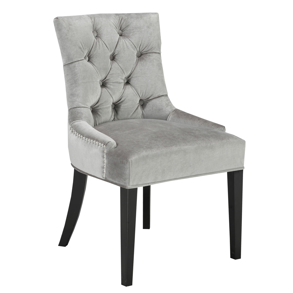 - Fabriquée en bois massif au fini noyer foncé et en tissu de velours gris, cette agréable chaise contemporaine est enveloppée d'un revêtement de couleur unie avec des capitons de boutons sur le dossier de la chaise et une garniture de tête de clou argentée sur le côté.