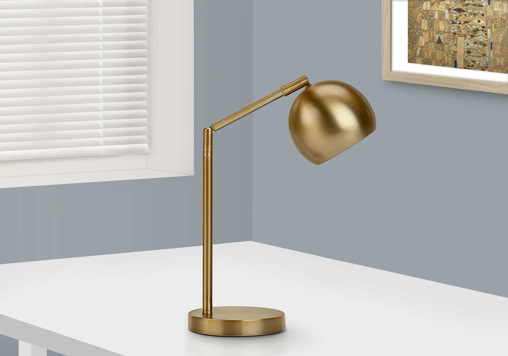 - Placez cette lampe de table contemporaine de 19 po d'inspiration rétro avec une base en métal doré robuste et un abat-jour doré en forme de globe fixé par un col flexible pour un angle d'éclairage réglable, pour égayer un bureau, un salon ou une chambre.