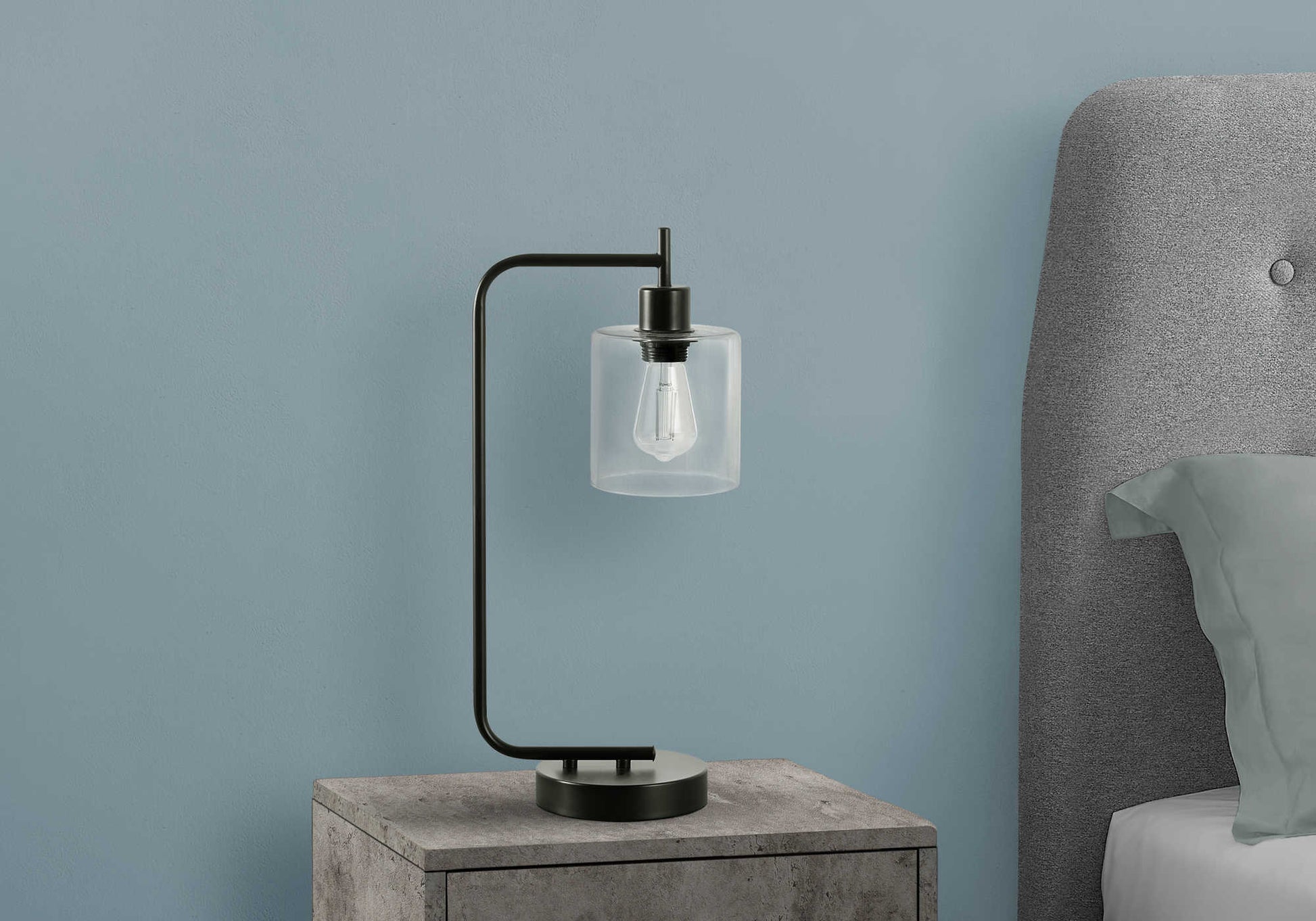 - Ajoutez une ambiance industrielle à votre espace avec cette lampe de table moderne et élégante de 20 po au design en métal noir, avec un bras mince tenant un abat-jour en verre transparent, parfaite pour être placée dans un bureau, un salon ou une chambre.