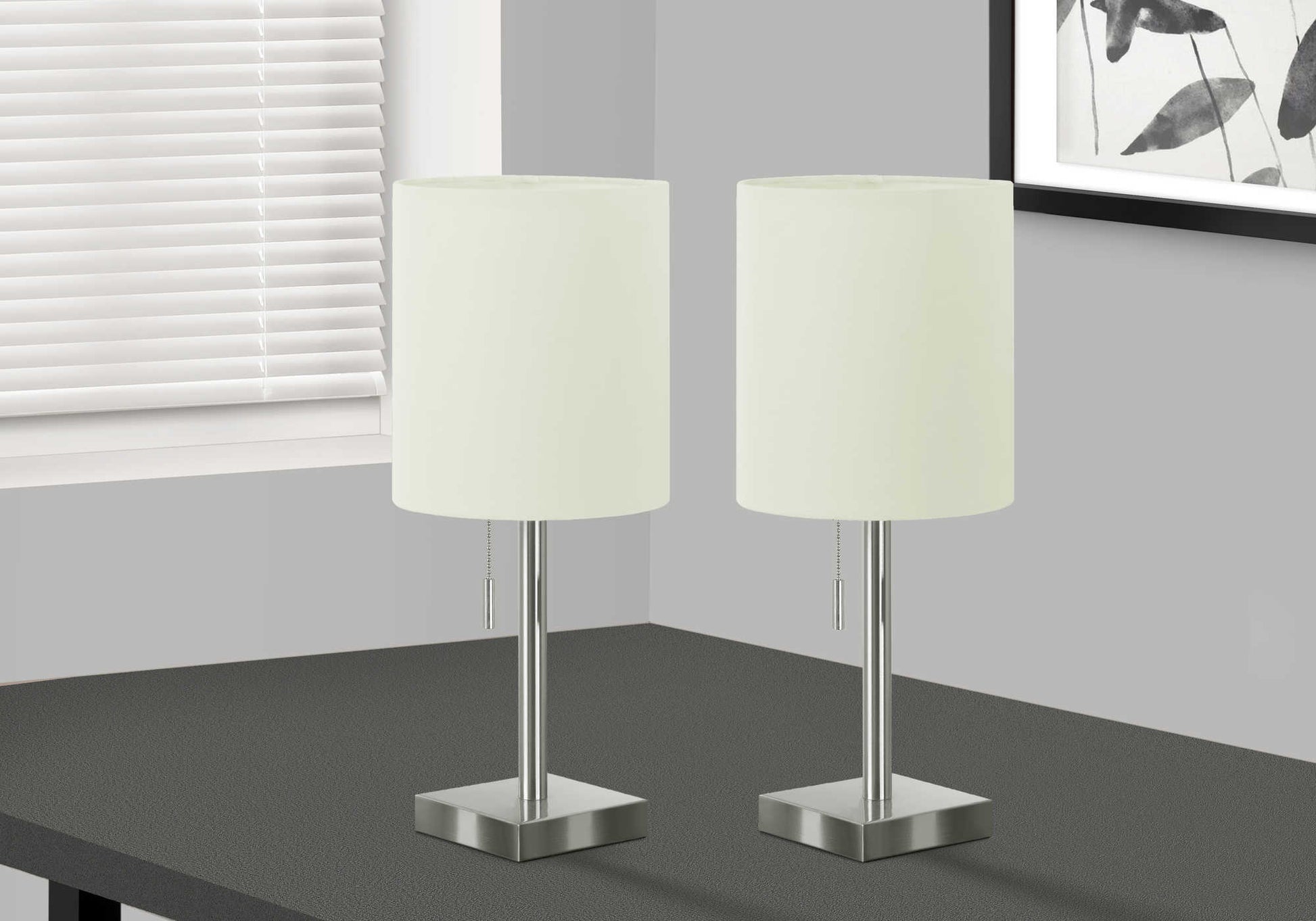 - Égayez votre bureau, votre salon, votre entrée ou votre chambre avec cet ensemble de 2 lampes de table contemporaines élégantes et compactes de 17 po dans une finition en métal nickel, surmontées de simples abat-jour cylindriques en tissu ivoire.