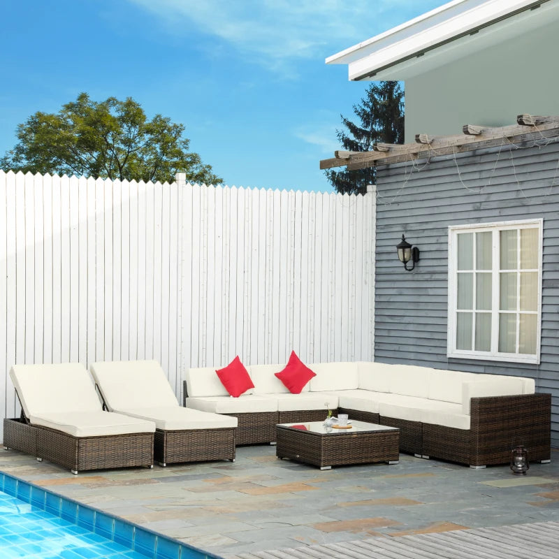 - Ensemble de canapés 9 pièces : Cet ensemble de patio polyvalent de 9 pièces comprend 4 chaises du milieu, 2 chaises d'angle, 2 chaises longues et une table centrale, peut être disposé dans une variété de configurations pour s'adapter à votre espace extérieur. Créez un grand canapé pour vous installer confortablement près de votre foyer, ou séparez les chaises autour de la table centrale pour accueillir vos invités à la garden-party. Avec cet ensemble de meubles de patio modulaires en rotin, les possibilités de conception sont infinies.