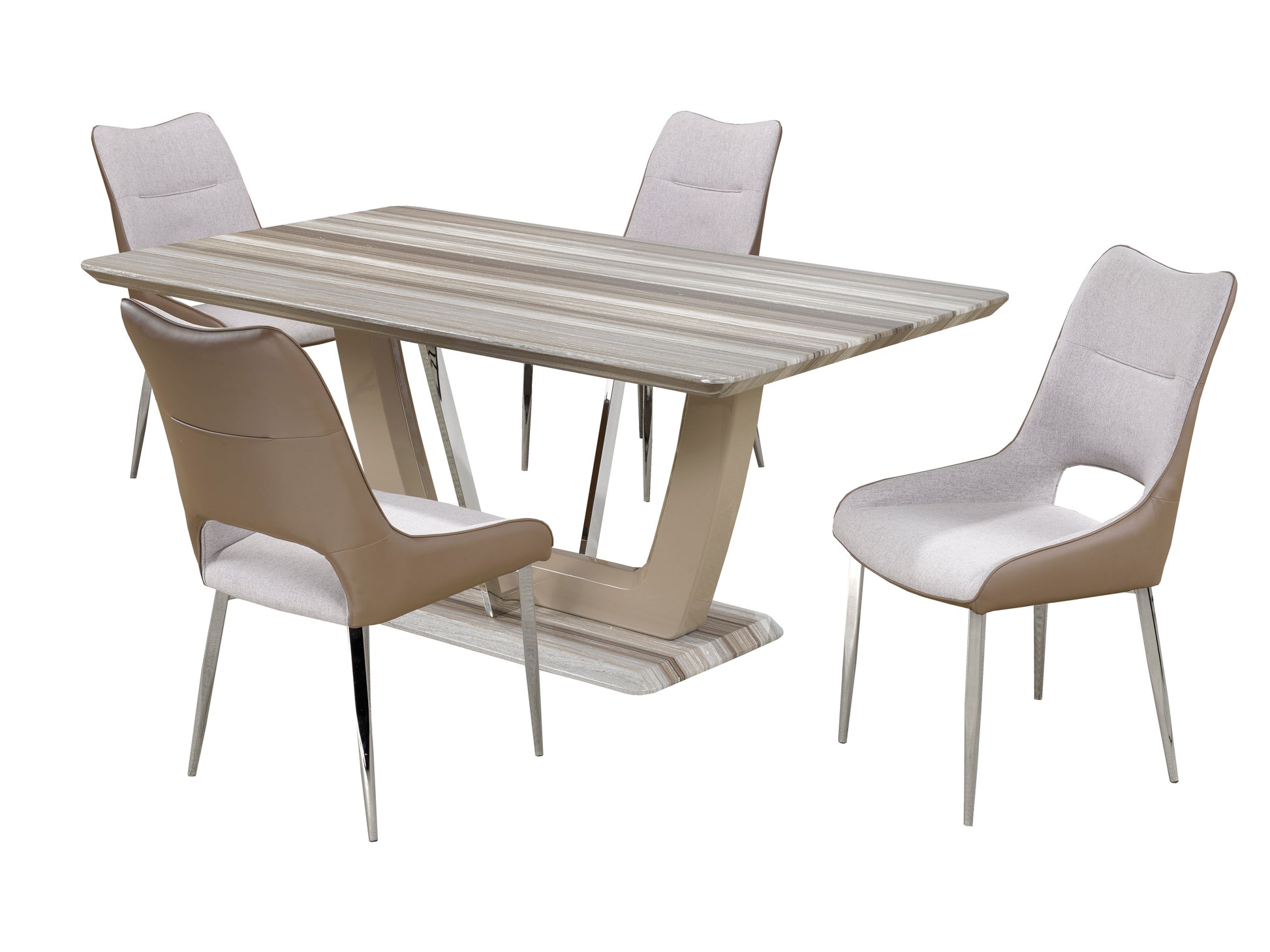 Cet ensemble de salle à manger Bentley de cinq pièces est un ajout élégant à tout espace de salle à manger pour une forte aura contemporaine. Dotée d'un élégant plateau en faux marbre, la table est soulevée par une base robuste en forme de U au design unique qui va certainement gagner beaucoup de compliments de la part des invités. Cette table est accompagnée de quatre chaises rembourrées et recouvertes d'un tissu opulent beige et marron pour un contraste saisissant. Le dossier haut et légèrement incliné est conçu pour une flexibilité accrue et une posture parfaite du dos. Pour une touche tendance supplémentaire à l'ensemble, les pieds de la chaise au fini chromé sont incurvés vers l'intérieur, créant une influence attrayante sur votre salle à manger.