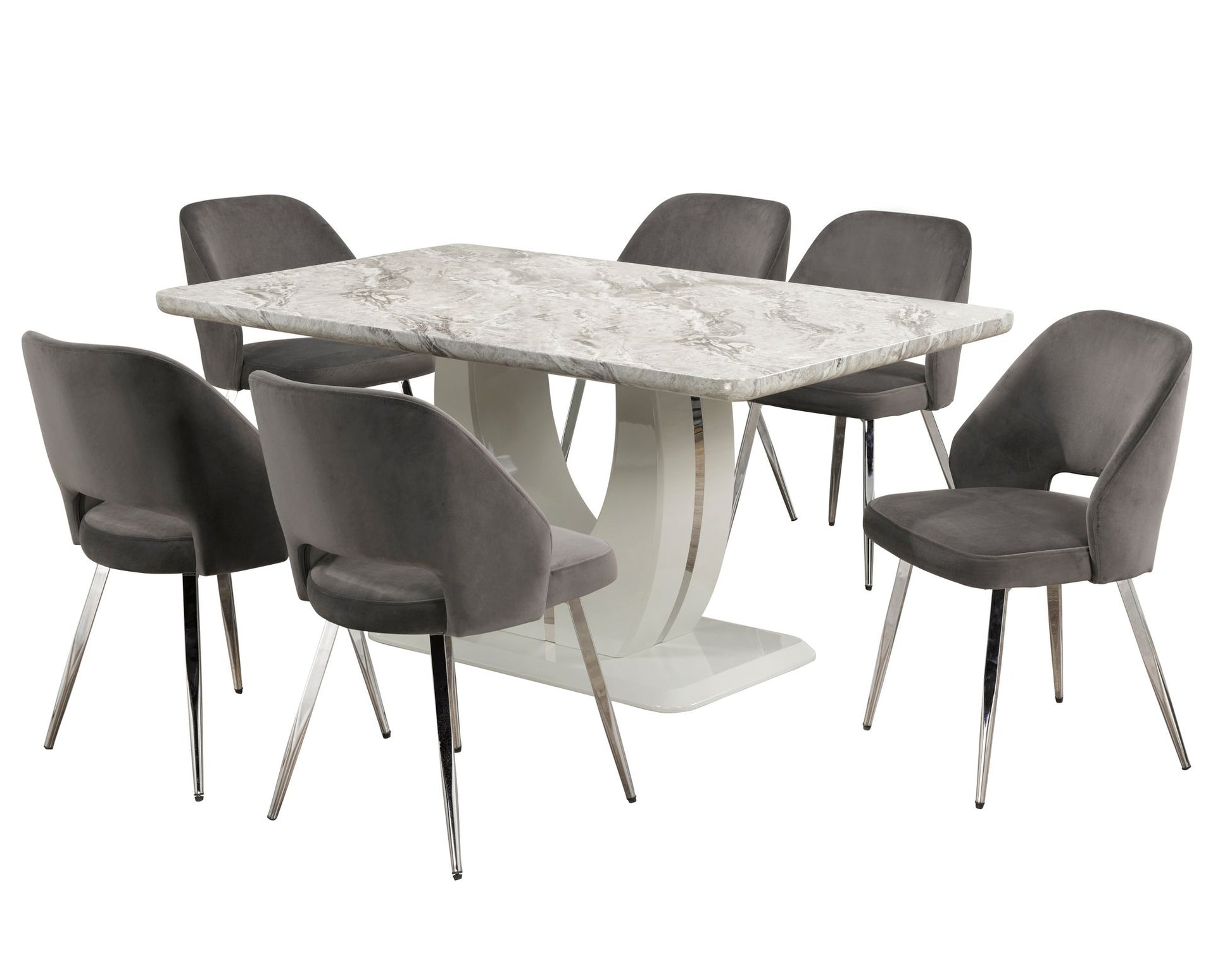 Améliorez l'esthétique de votre salle à manger avec l'ensemble de salle à manger Santana de style contemporain qui comprend une table magnifiquement conçue ainsi que quatre chaises d'inspiration industrielle. Avec un plateau en marbre de papier gris sous-tonifié, la table rectangulaire met l'accent sur une apparence élégante avec une base innovante en forme de U flanquant une doublure en métal au milieu pour un contraste radieux. Les chaises sont dotées d'un bord arrondi et d'un support de dossier drapé dans une housse en tissu de qualité supérieure avec un espace de siège rembourré confortable dans une palette de couleurs gris cendré. Les pieds coniques sont chromés à la perfection, assurant la durabilité. L'ensemble de salle à manger Santana est garanti pour transformer votre salle à manger tout en induisant une expérience culinaire agréable avec vos proches.