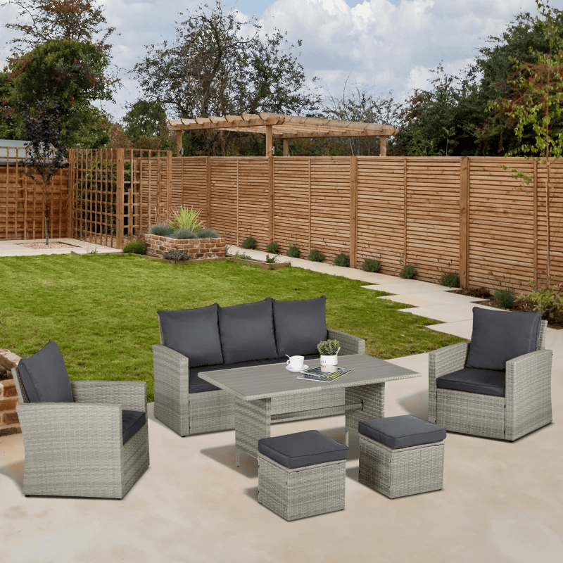 - Informations sur les ensembles de meubles de patio : Dimension du canapé simple : 27,25"L x 28,25"P x 32"H. Canapé trois places : 62,5"L x 28,25"P x 32"H. Dimension du repose-pieds : 15,75"L x 15,75"P x 13"H. Dimension de la table à manger : 52"L x 30"L x 26,5"H. Hauteur du siège du canapé : 12,5". Assemblage requis.