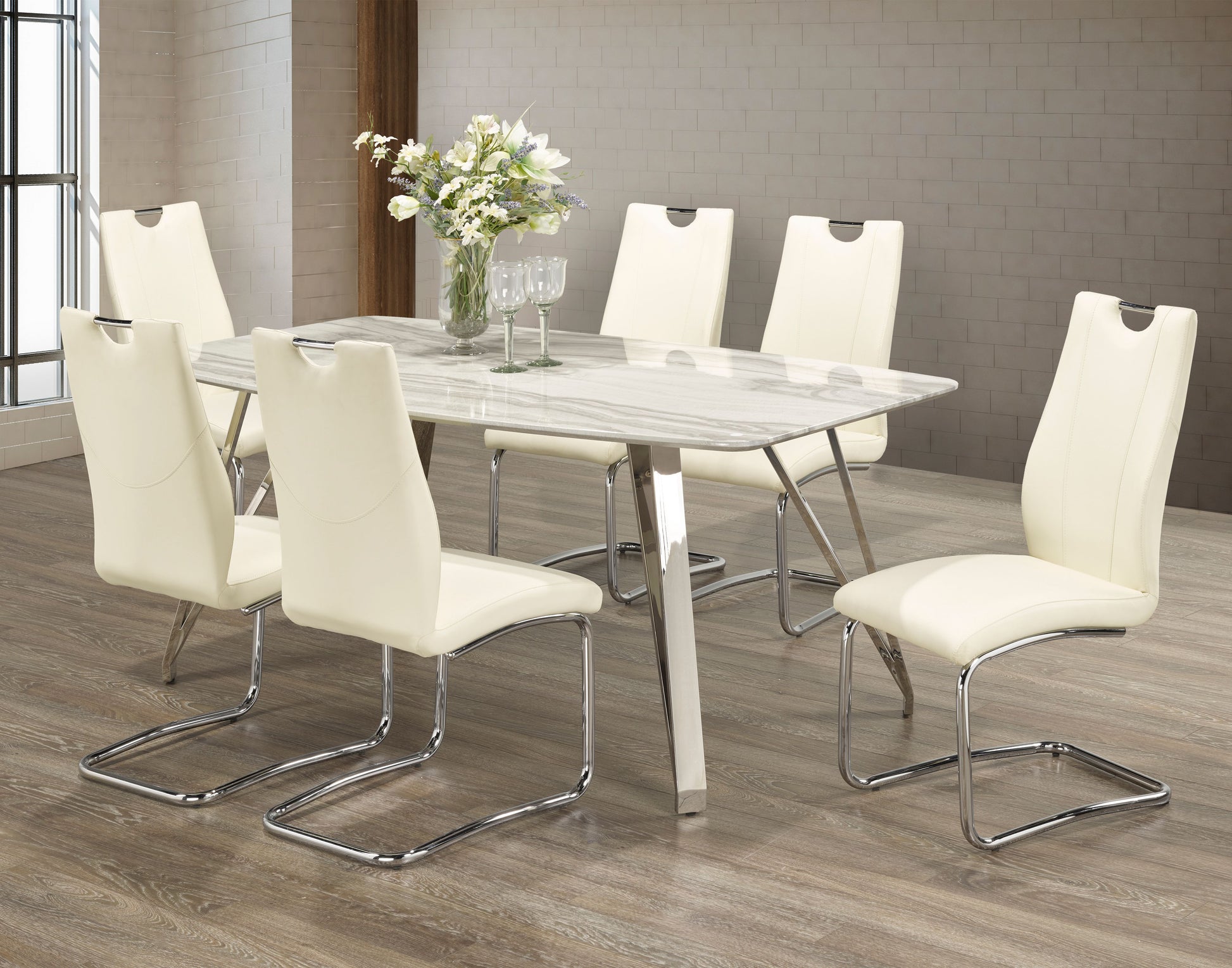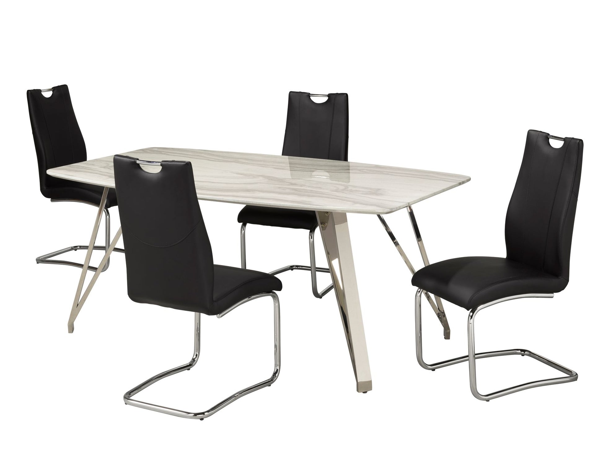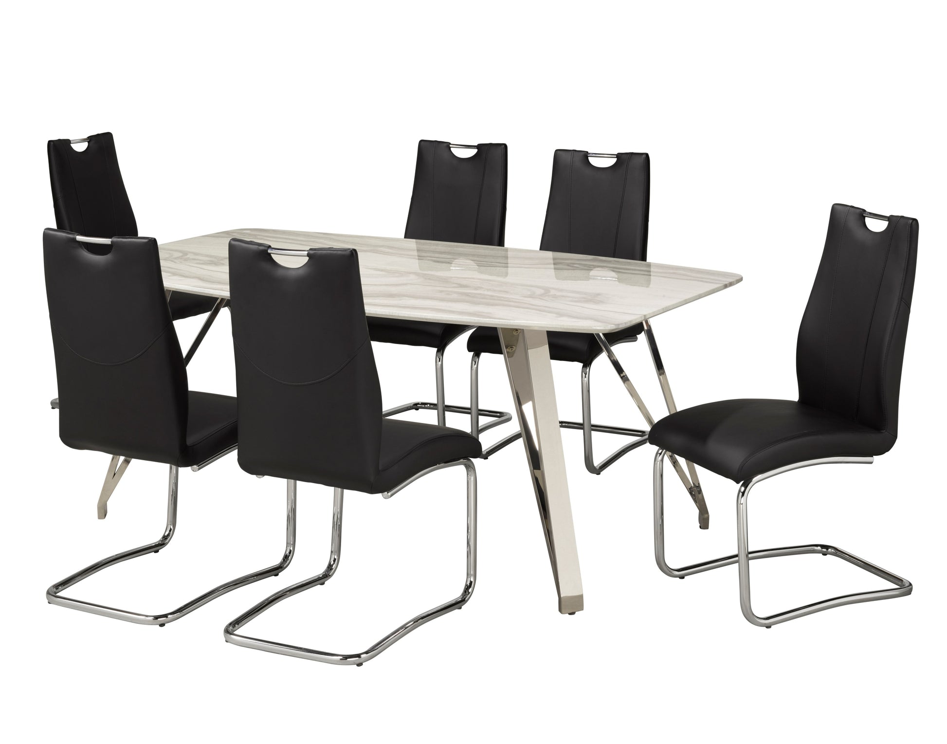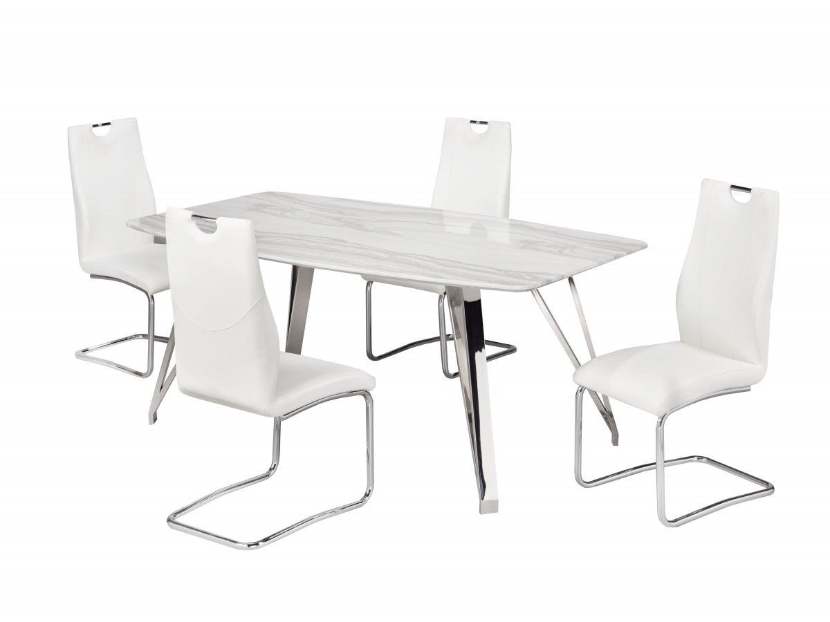 L'ensemble de table à manger Tavern accentue un design contemporain ponctuant une essence industrielle nette. Cet ensemble de salle à manger de cinq pièces comprend une table spacieuse et quatre chaises modernes aux lignes épurées qui ne manqueront pas d'attirer l'attention de vos invités. Doté d'une table en faux marbre blanc avec des motifs gris complexes soutenus par des pieds évasés dans une finition chromée argentée. Associé à des chaises soutenant une housse en tissu de qualité supérieure finement rembourrée et rembourrée avec un dossier légèrement incliné vers l'intérieur pour un confort accru. Les pieds robustes en forme de U chromés contribuent non seulement au design, mais offrent également une stabilité optimale. Pour un agencement minimaliste, les chaises peuvent être glissées sans effort sous la table pour économiser de l'espace lorsqu'elles ne sont pas utilisées.