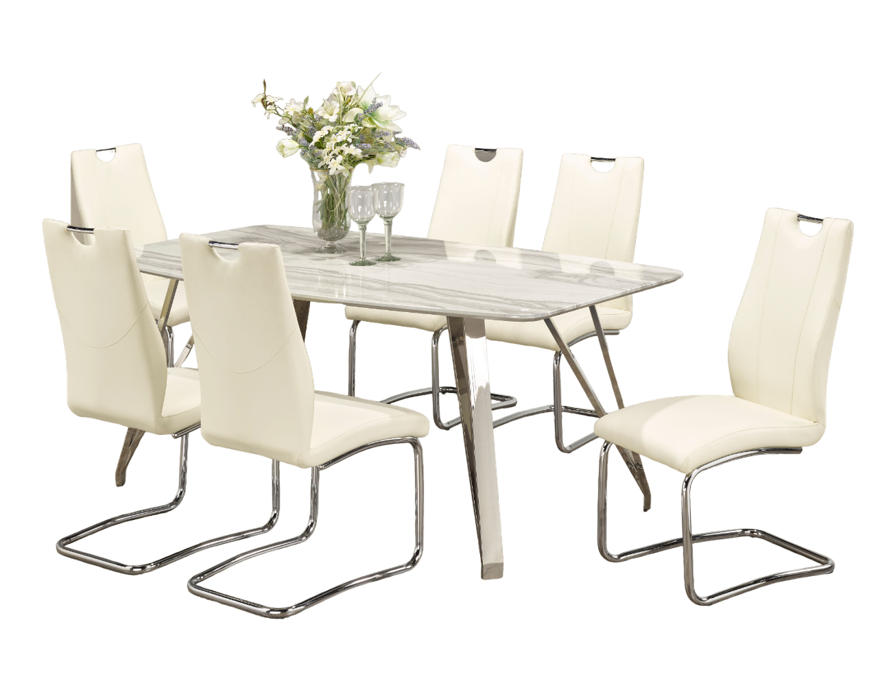 • Comprend : table + 4 chaises de salle à manger || Comprend : table + 6 chaises de salle à manger• Pieds de table évasés