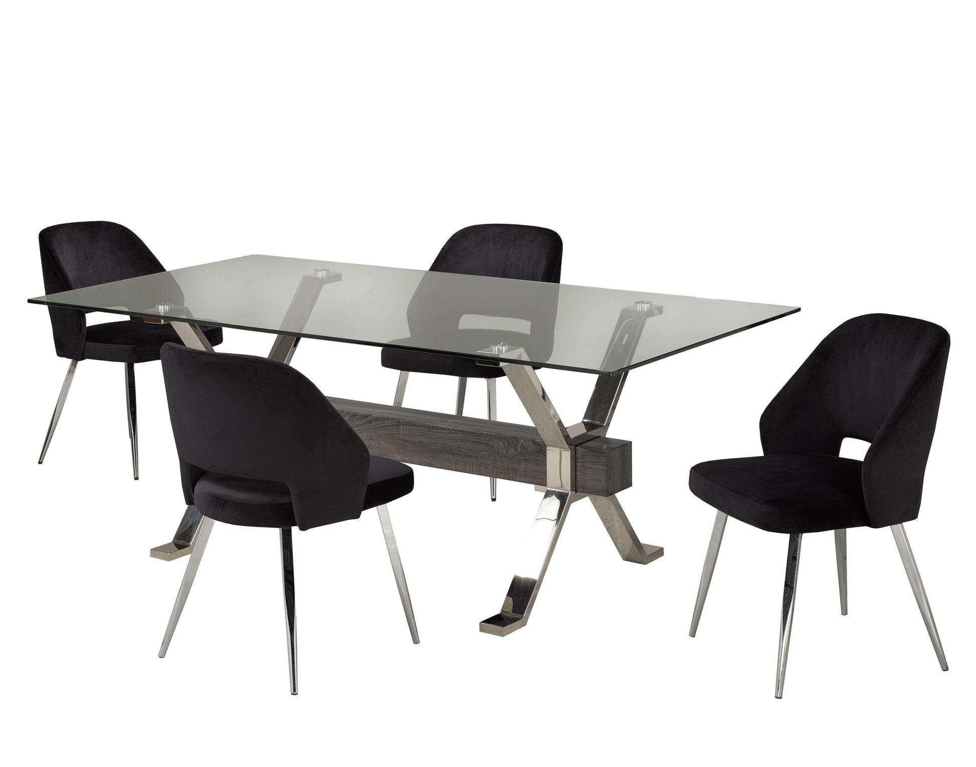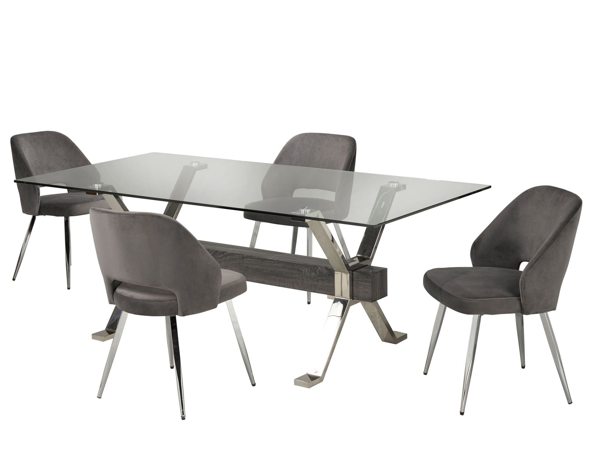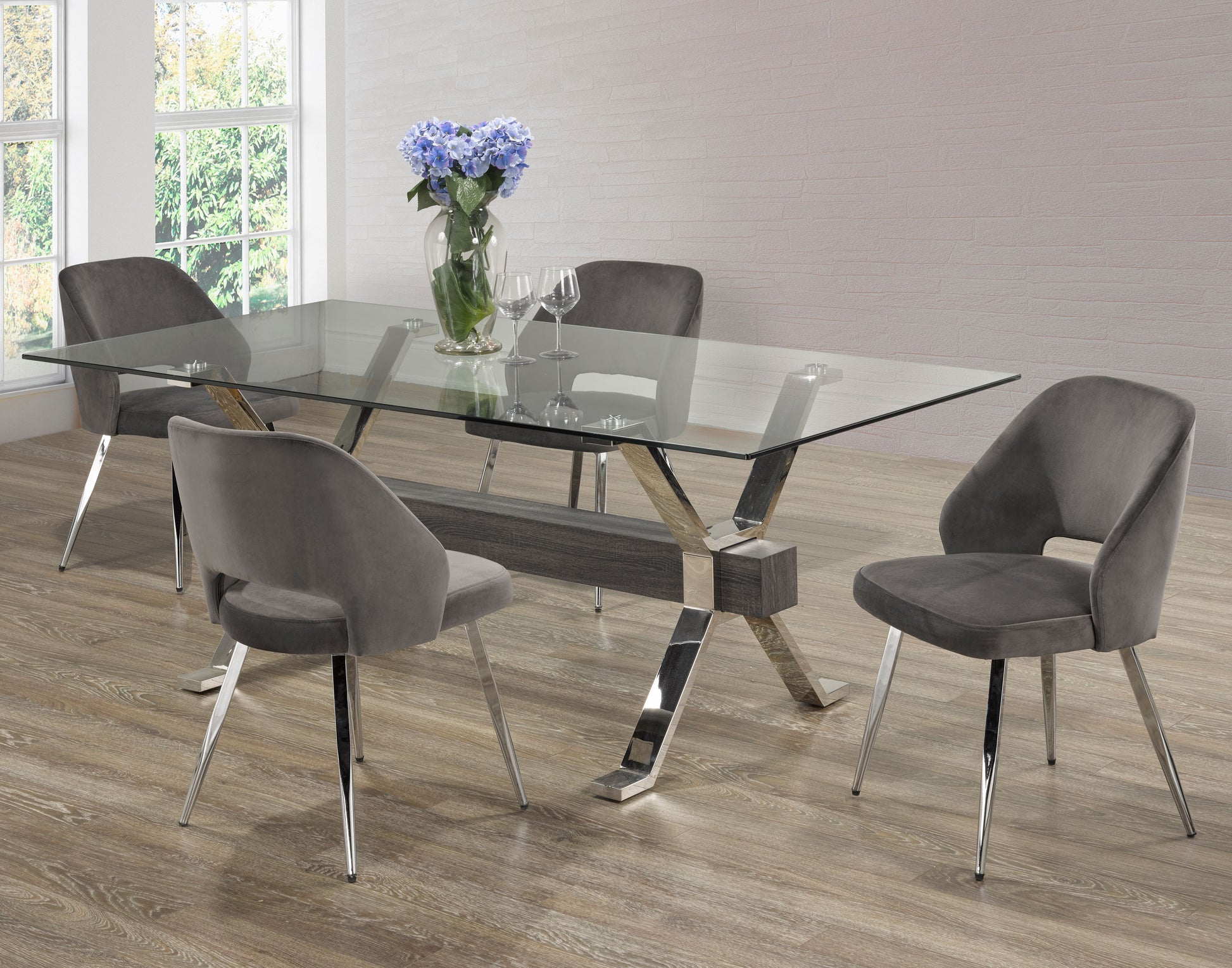 L'aspect luxueux de l'ensemble de table de salle à manger Lexis s'articule autour d'une table rectangulaire élégante avec une base en acier inoxydable au design créatif de finition chromée à la perfection, équilibrant un verre trempé transparent sur le dessus. Cet ensemble de salle à manger rétro-moderne comprend quatre chaises avec des sièges rembourrés et un revêtement gris nuageux avec un dossier incurvé pour un meilleur soutien et des pieds effilés finis en chrome pour la stabilité. L'ensemble de salle à manger spacieux maintient une esthétique légère pour une expérience culinaire incroyable avec votre famille et vos amis tout en capturant l'esprit de l'ère moderne dans son style contemporain.