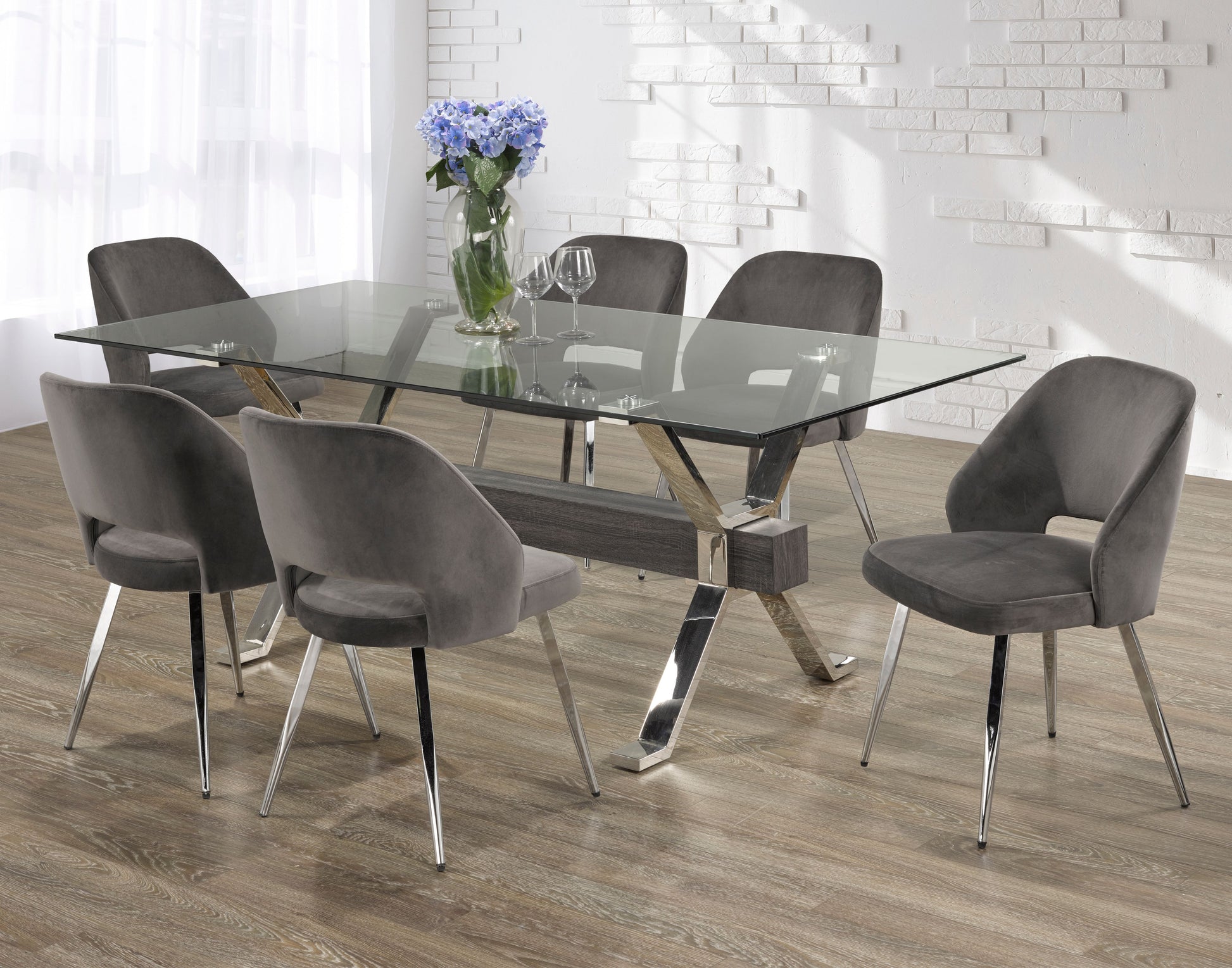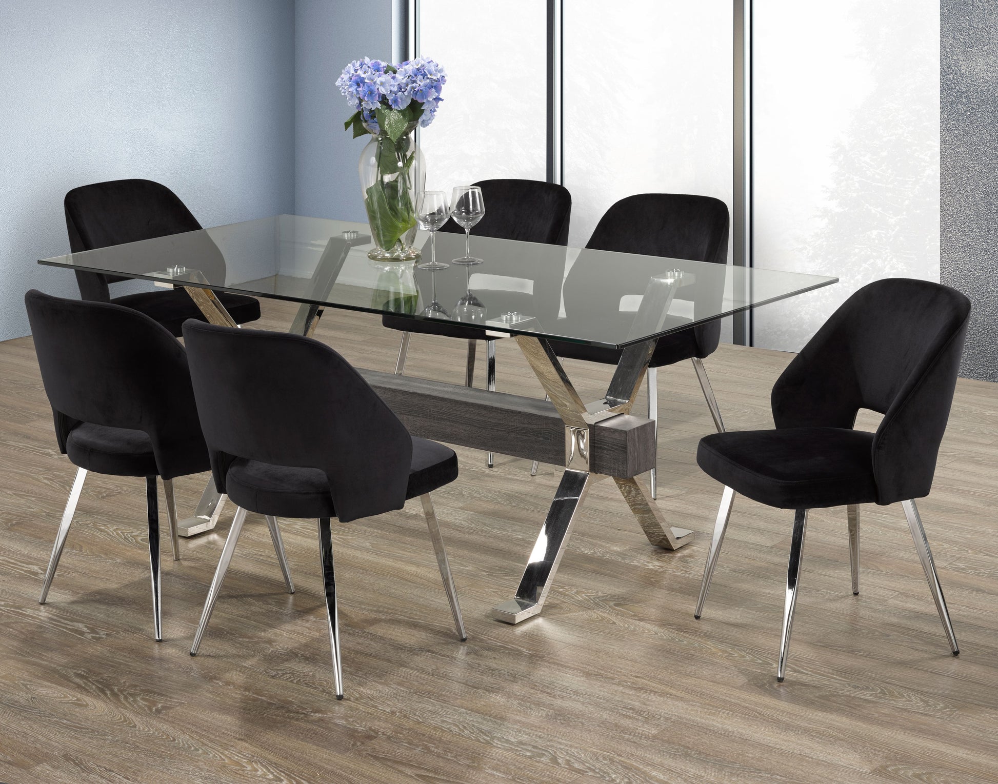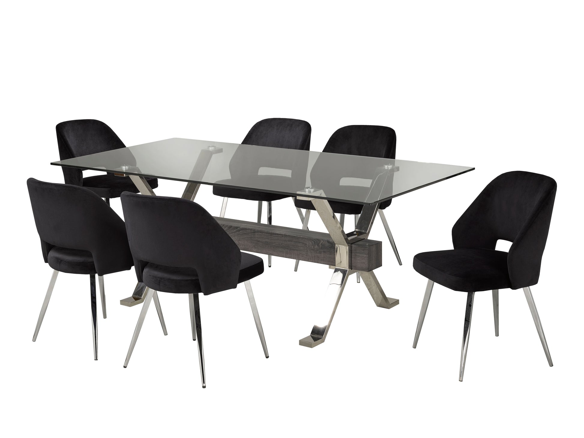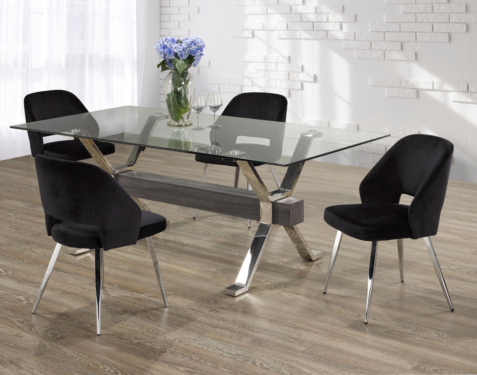 L'aspect luxueux de l'ensemble de table de salle à manger Lexis s'articule autour d'une table rectangulaire élégante avec une base en acier inoxydable au design créatif de finition chromée à la perfection, équilibrant un verre trempé transparent sur le dessus. Cet ensemble de salle à manger rétro-moderne comprend quatre chaises avec des sièges rembourrés et un revêtement gris nuageux avec un dossier incurvé pour un meilleur soutien et des pieds effilés finis en chrome pour la stabilité. L'ensemble de salle à manger spacieux maintient une esthétique légère pour une expérience culinaire incroyable avec votre famille et vos amis tout en capturant l'esprit de l'ère moderne dans son style contemporain.