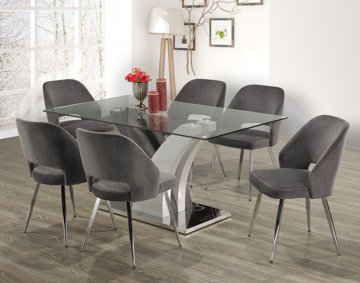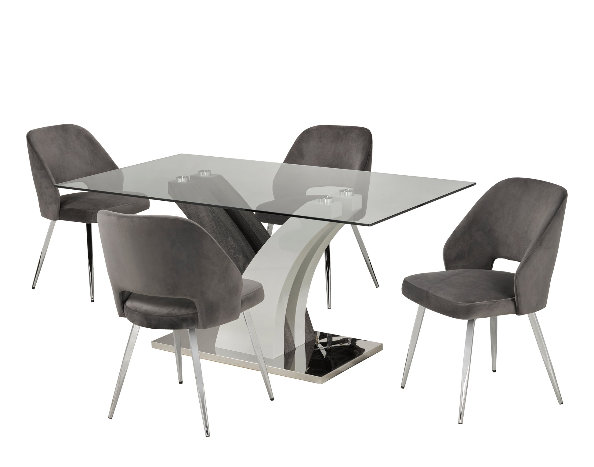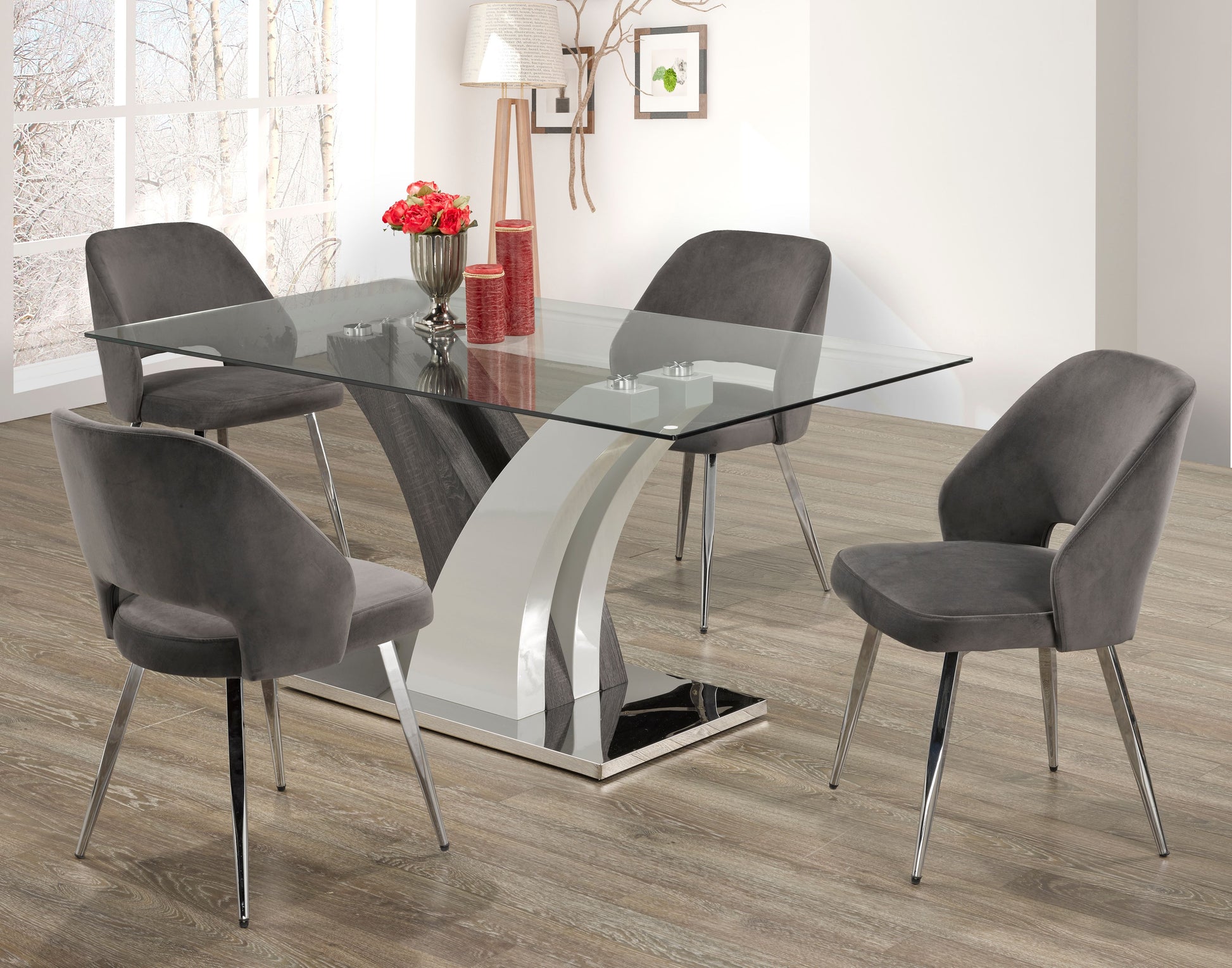 Apportez une touche de style contemporain à votre espace de vie avec cet ensemble de salle à manger magnifiquement conçu qui s'intègre à n'importe quel décor moderne. Avec une base de table aussi magnifique, elle doit être recouverte de verre trempé pour laisser passer la lumière sur cette base bicolore chromée. Les chaises présentent un design du milieu du siècle avec des pieds en acier revêtus d'une finition chromée brillante et un espace d'assise rembourré avec un dossier profilé enveloppé d'un rembourrage aux tons gris froid assure une coordination facile avec n'importe quelle palette de couleurs intérieures sans la submerger. Pour profiter d'un dîner familial confortable dans un cadre minimal et audacieux, opter pour cet ensemble de salle à manger de cinq pièces sera une affaire gagnant-gagnant.