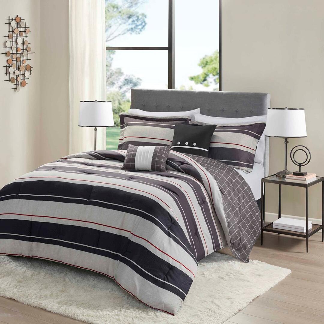 L'ensemble d'édredon réversible Madison Park Essentials Dalton offre une transformation totale et une mise à jour moderne de votre chambre à coucher. L'édredon en microfibre ultra-doux présente des rayures gris ombré et anthracite sur le devant avec un imprimé de carreaux de fenêtre au verso, pour deux looks contemporains pointus en un. Un oreiller décoratif coordonné avec des accents de boutons apporte la touche finale. Apportant le meilleur de la santé et du bien-être, cet ensemble de literie dispose également d'un traitement antimicrobien qui fournit une répétition intégrée du design réversible de la couette. Certifié Oeko-Tex, ne contient aucune substance ou produit chimique nocif)