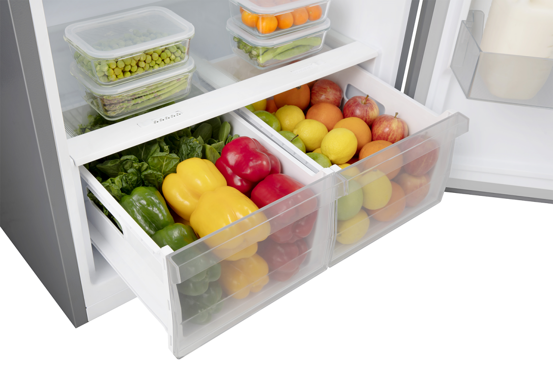 D'excellentes capacités de stockage vous attendent dans ce réfrigérateur à congélateur supérieur de Hisense. Les bacs de porte d'un gallon vous permettent de ranger facilement des cartons de lait volumineux et des bouteilles de boisson gazeuse pour libérer de l'espace sur les étagères. De plus, les bacs à légumes à humidité contrôlée gardent vos produits frais et organisés. Un éclairage LED lumineux et économe en énergie illumine le contenu du réfrigérateur d'un coin à l'autre, afin que vous puissiez trouver vos collations préférées en un clin d'œil. Avec une finition argentée élégante et des poignées encastrées, ce réfrigérateur est prêt à ajouter une touche chic à votre cuisine.