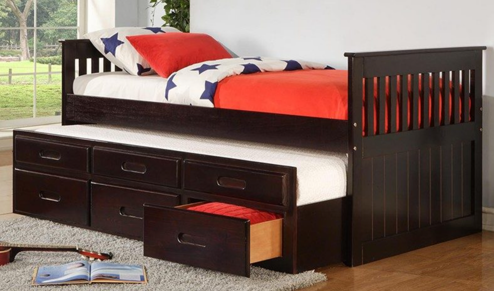 Comprend un lit gigogne coulissant et 3 tiroirs coulissants