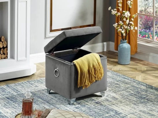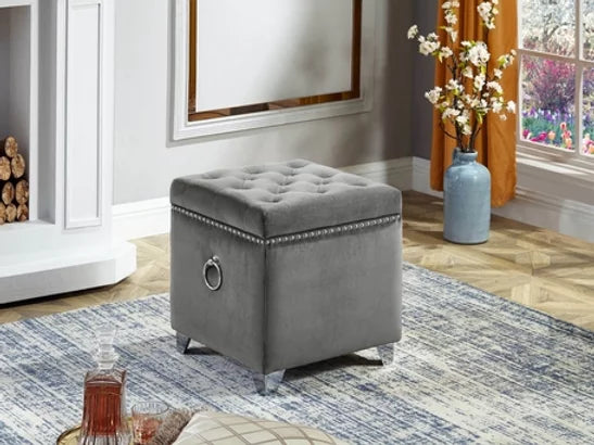 Pouf de rangement en velours gris avec capitonnage profond, anneau chromé, détails cloutés et pattes chromées