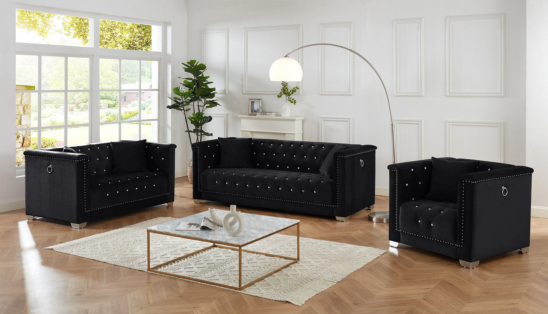 Velours noir avec capitonnage profond et détails de têtes de clous, pieds chromés, anneau d'accent et oreillers