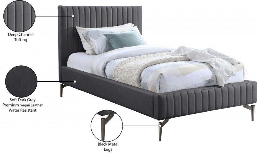 Offrez-vous le confort et le luxe du lit simple Gallo Vegan Leather et transformez votre chambre en un havre de détente. Cette pièce exquise est dotée d'un extérieur en cuir végétalien gris foncé doux et luxueux qui respire l'élégance et la sophistication. Ses propriétés résistantes à l’eau et anti-rayures garantissent durabilité et beauté durable. Le capitonnage profond ajoute de la profondeur et de la texture à la conception globale, tandis que les élégants pieds en métal noir élèvent son caractère et son charme à de nouveaux sommets.