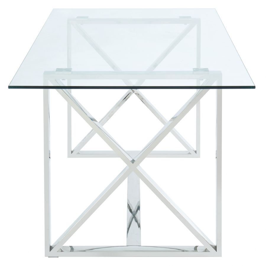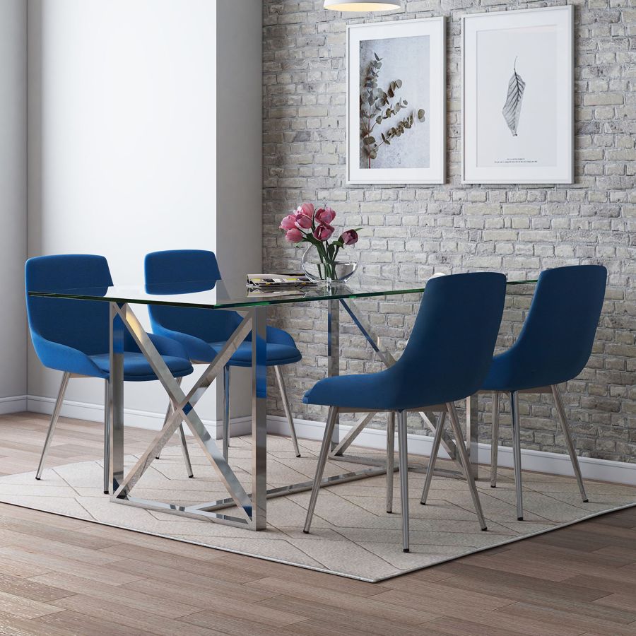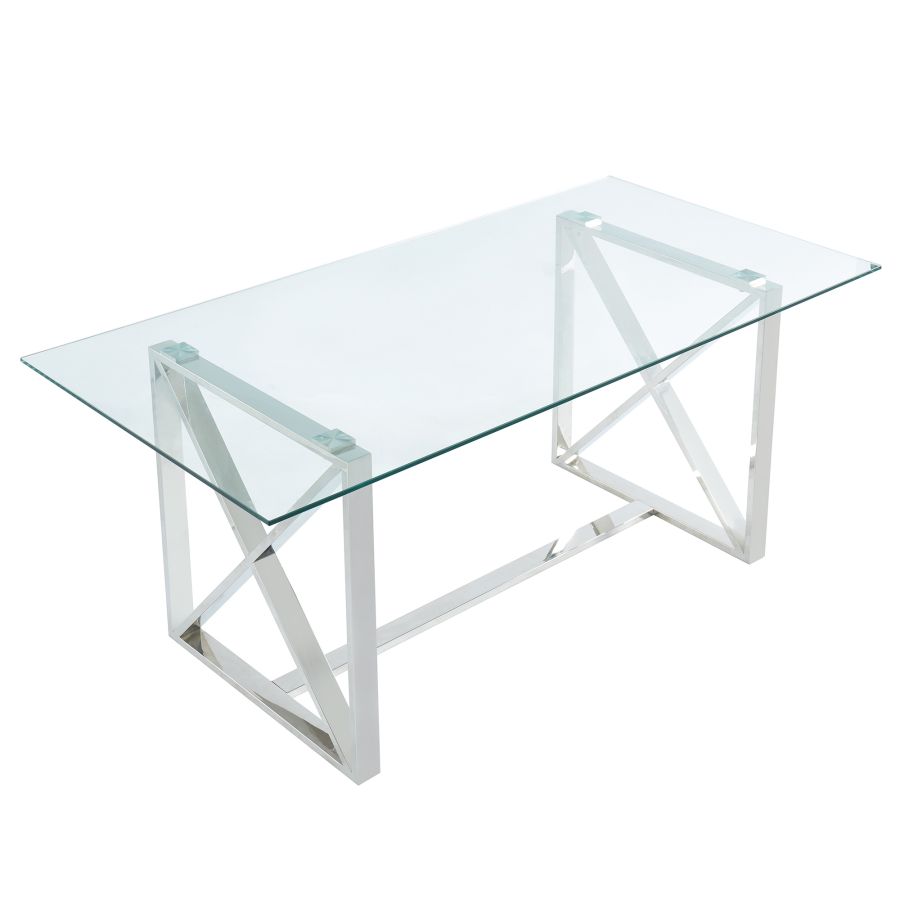 Open up your space with this beautiful contemporary dining table. The silver finish on the unique geometric-patterned legs gives a little sparkle to the light and airy look of the glass-topped table. It will look stunning with four chairs but will comfortably accommodate 6 - and mix and match with different chair styles and finishes to create the perfect look that works for you!