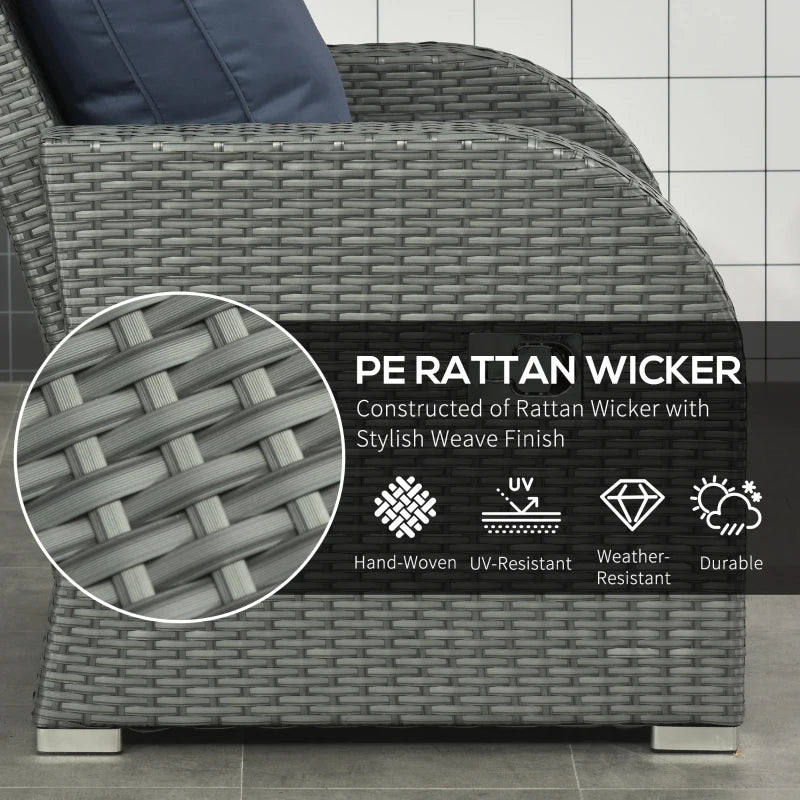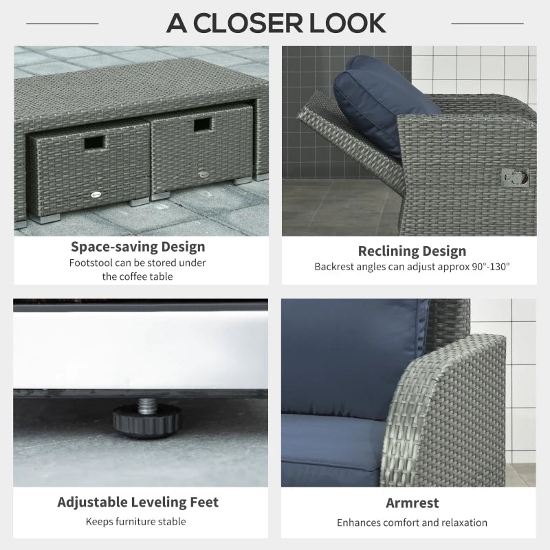 Meubles de patio avec coussins, 6 pièces en osier PE, ensemble de conversation avec un canapé à trois places, 2 chaises inclinables, 2 repose-pieds et une table, bleu foncé