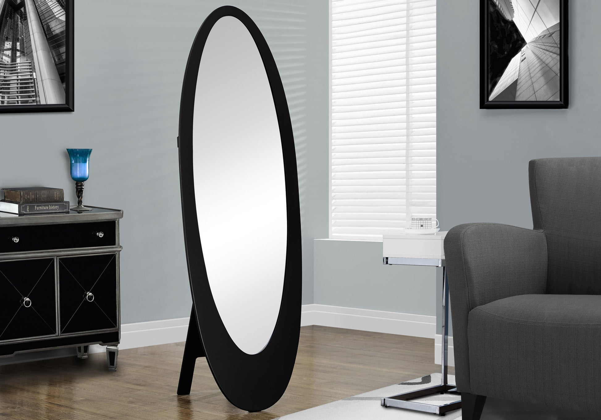 Miroir, miroir au mur, les miroirs en pied les battent tous ! Vous pouvez être la plus belle de toutes avec ce miroir psyché de style contemporain de forme ovale avec un support arrière robuste vous permettant de le placer n'importe où dans une pièce. Ce miroir autoportant avec un magnifique cadre aux tons noirs est la pièce d'accent parfaite à avoir dans une chambre à coucher tout en s'habillant pour le travail ou une soirée chic.