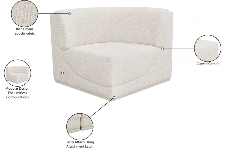 Rencontrez la quintessence du style et de la fonctionnalité avec ce coin de salon en tissu bouclé Ollie, qui fait partie de la collection modulaire Ollie. Merveille contemporaine, ce coin est doté d'un revêtement en tissu bouclé riche, chic et invitant, lui conférant une texture somptueuse qui respire l'élégance et le luxe. Les coins incurvés ajoutent à l'apparence visuelle du canapé sectionnel tout en maximisant le confort d'assise lorsque vous vous prélassez, lisez ou vous divertissez. Associez-le facilement à d'autres articles de la collection Ollie, grâce à un loquet de fixation en dessous.
