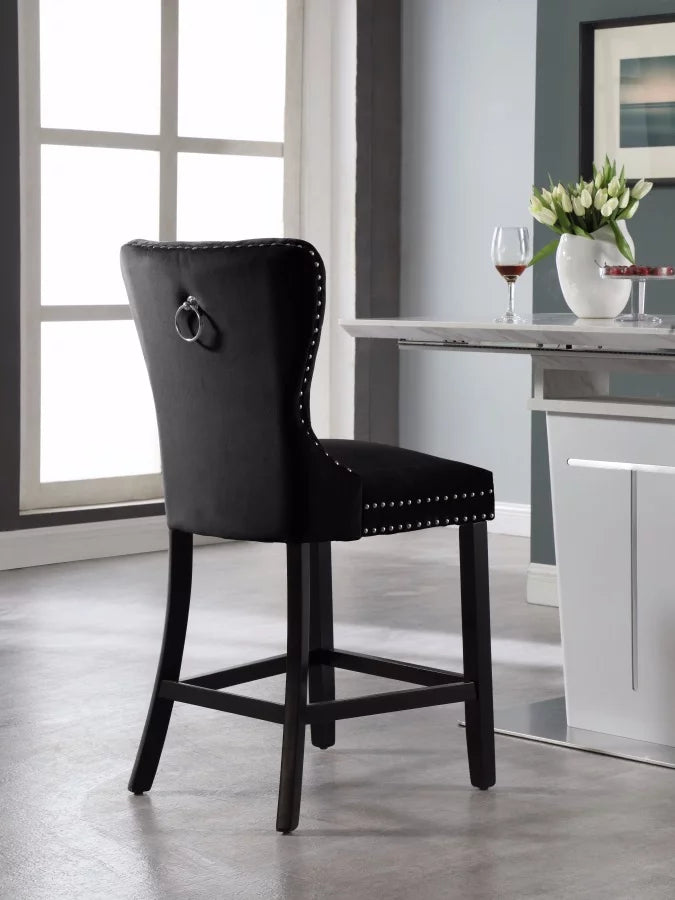 Tabouret de bar rembourré en velours noir avec tête de clou chromée et anneau chromé
