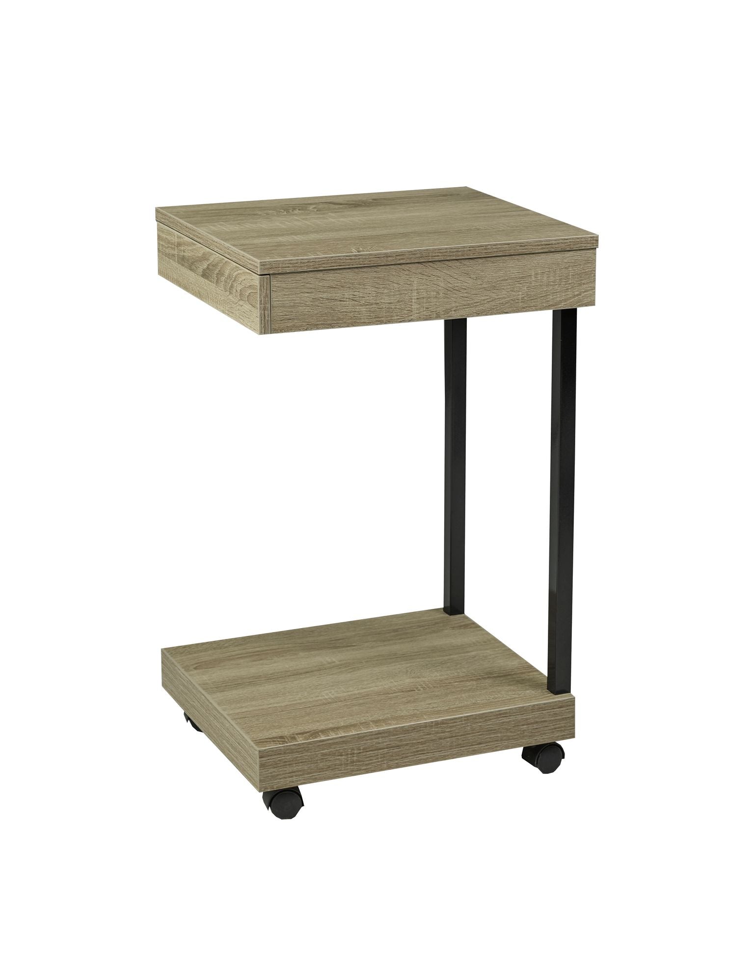 Parfait pour les petits espaces, ce support peut être utilisé à diverses fins. Son design simpliste comporte deux niveaux : un niveau inférieur pour les objets décoratifs ou pour garder les éléments essentiels facilement accessibles, et le niveau supérieur est idéal pour un ordinateur portable. Installé sur quatre roulettes, le support peut être déplacé facilement ; utilisez-le en position assise ou debout, et roulez-le facilement lorsqu'il n'est pas utilisé. Le tiroir à panneau plat affleurant offre un stockage supplémentaire hors de vue pour les CD, chargeurs et autres petits accessoires