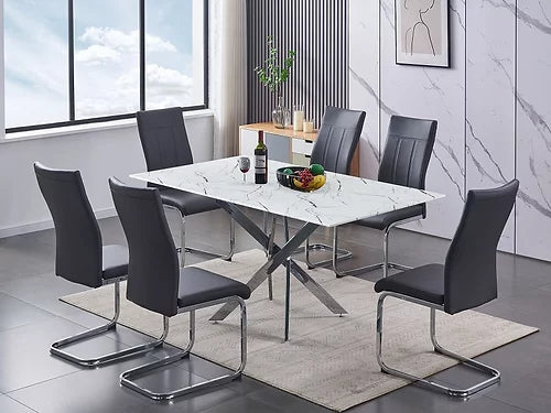 Table : verre en marbre blanc trempé de 10 mm avec pieds chromés