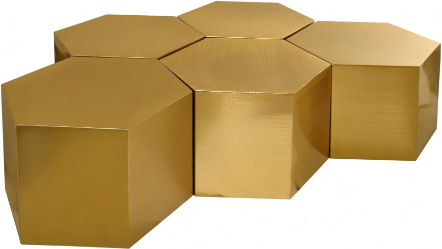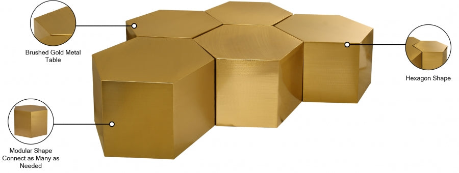 Personnalisez votre espace moderne avec le style simple de cet ensemble de cinq pièces de table modulaire Hexagon en or brossé. Utilisez une table seule pour un endroit pratique et élégant pour tenir vos boissons ou afficher une photo encadrée, ou ajoutez plusieurs tables ensemble pour créer encore plus d'espace pour se divertir ou jouer aux cartes ou aux jeux de société. Cette table en métal est entièrement personnalisable selon vos besoins et présente une forme hexagonale audacieuse pour une sensation de mode.