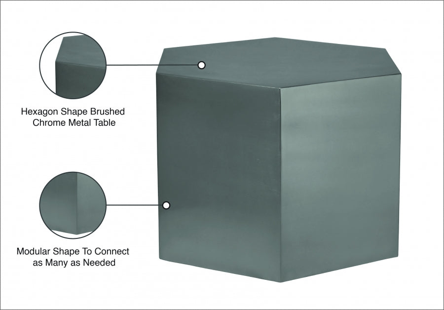 Personnalisez votre espace moderne avec le style épuré de cette table basse modulable Hexagon en métal chromé brossé. Utilisez une table seule pour un endroit pratique et élégant pour tenir vos boissons ou afficher une photo encadrée, ou ajoutez plusieurs tables ensemble pour créer encore plus d'espace pour se divertir ou jouer aux cartes ou aux jeux de société. Cette table en métal est entièrement personnalisable selon vos besoins et présente une forme hexagonale audacieuse pour une sensation de mode.