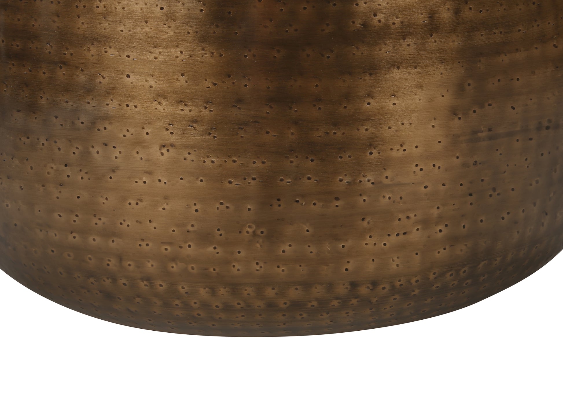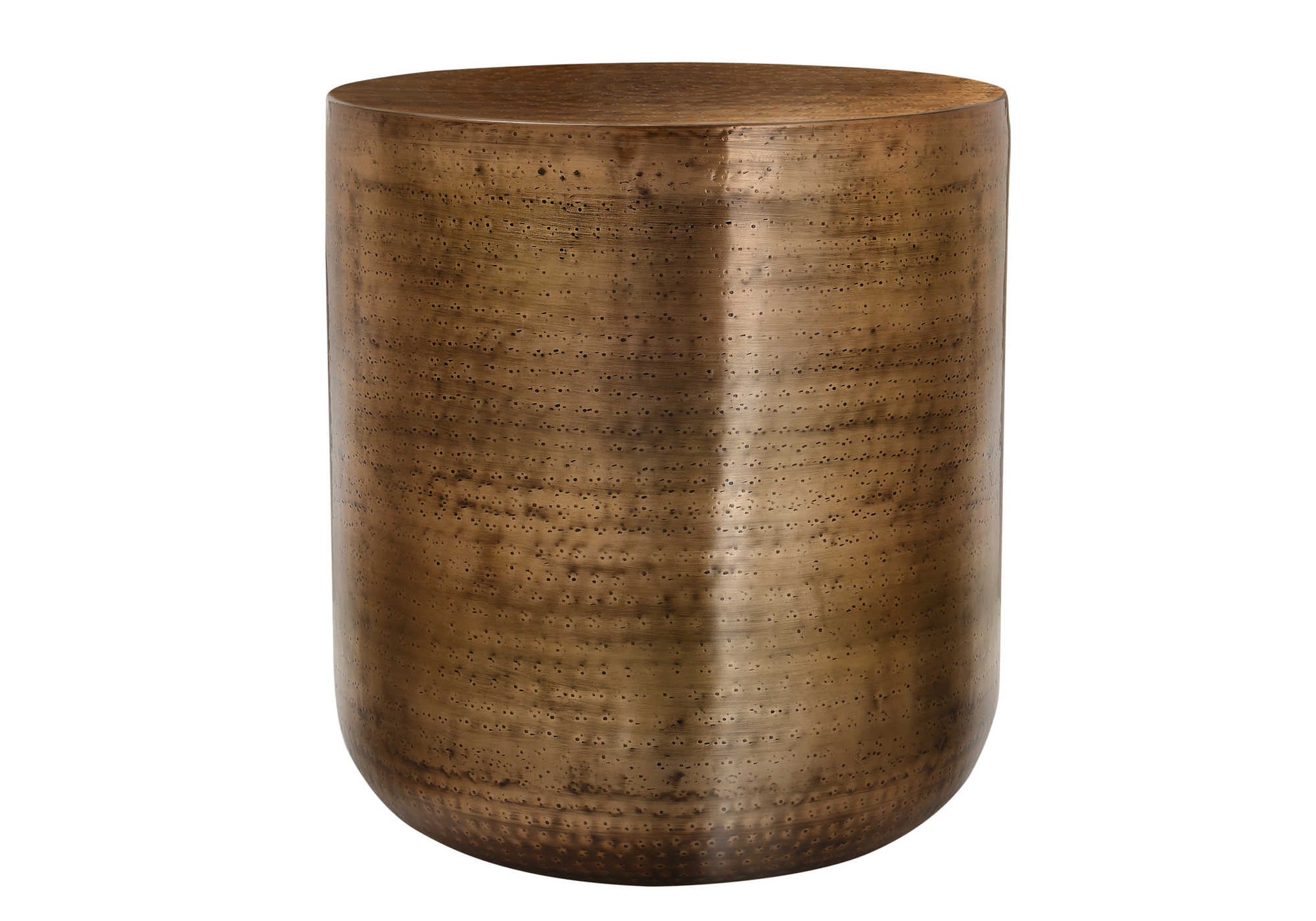 - Ce fabriqué à la main, 22quot; Cette table d'appoint haute en forme de tambour dans un métal cuivré antique et chaleureux confère une ambiance bohème-glam à un salon ou une chambre.