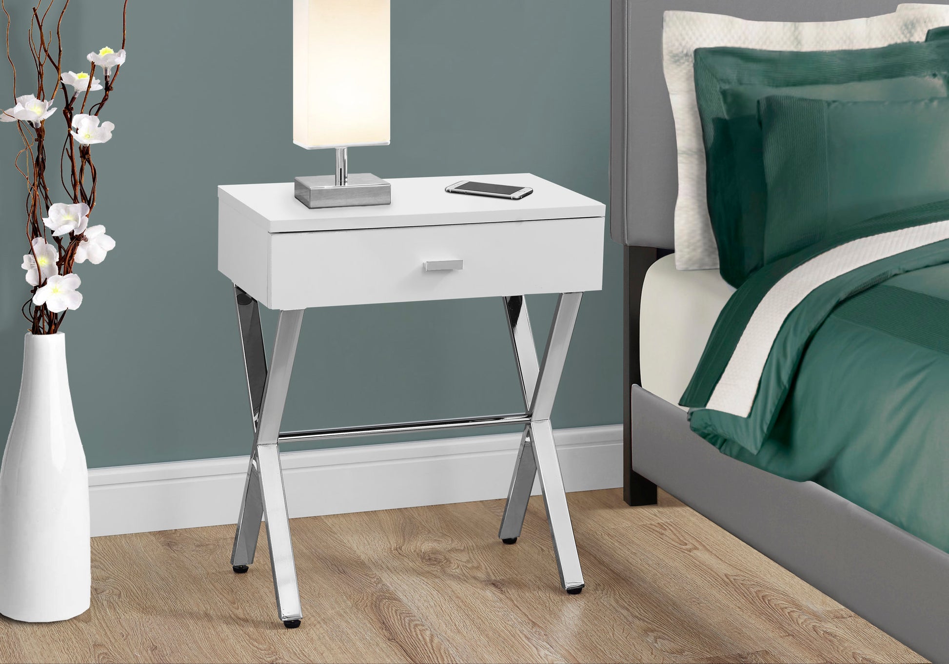 Pour une mise à niveau brillante de la maison, cette table d'appoint blanche brillante fait l'affaire (et plus encore !). Soutenue par une élégante base en métal chromé, la table de bout est conçue pour tout, des collations et des boissons à votre ordinateur portable, votre tablette et même des accents décoratifs qui complètent le reste de votre décor. Apportant une touche moderne à votre petite maison, condo ou appartement, cette table se glisse facilement à côté du canapé ou du lit. Séance d'étude ? Film préféré? Temps de lecture tranquille ? Cette table d'appoint gère tout ce qui précède et un espace de rangement supplémentaire grâce à un tiroir de rangement pratique de format légal/lettre.
