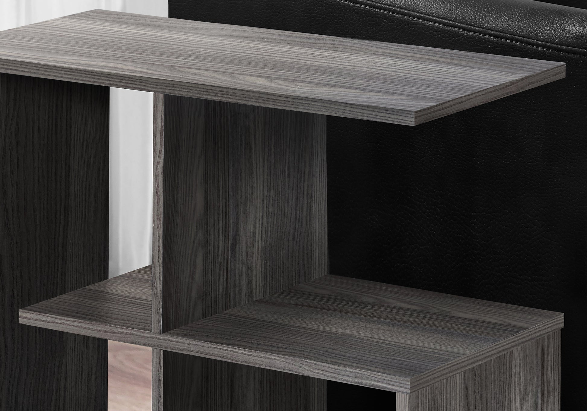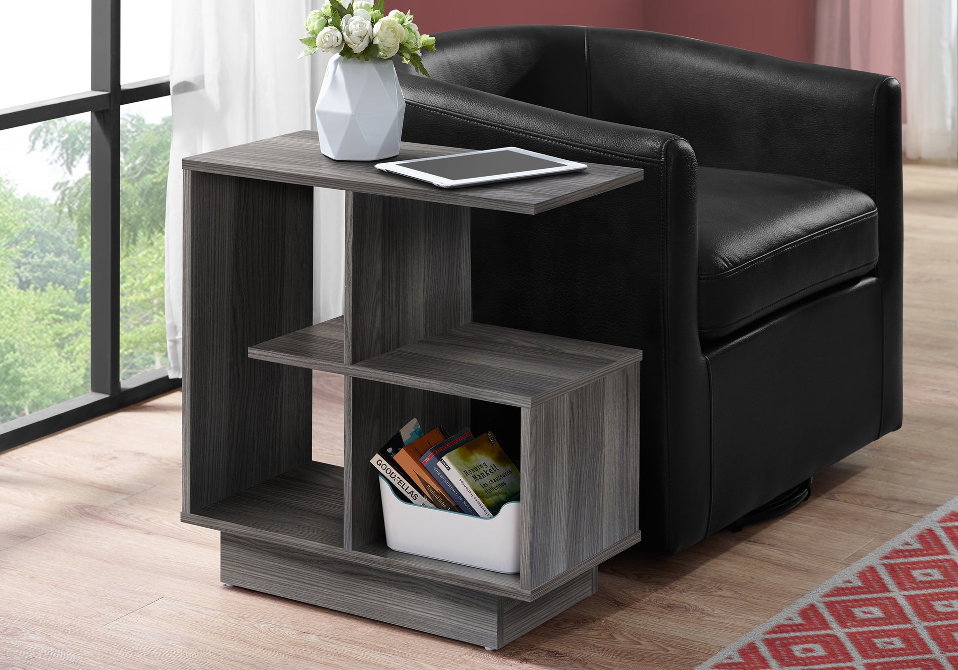 Cette table d'appoint d'appoint contemporaine et d'inspiration architecturale combine un style moderne avec des options de rangement en une seule pièce polyvalente. Le dessus de table rectangulaire est suffisamment spacieux pour y placer votre tablette, votre livre ou votre boisson. Les quatre étagères ouvertes en bas de différentes tailles offrent beaucoup de rangement pour les magazines, les livres, les objets décoratifs ou les composants audiovisuels, le tout soutenu par une base surélevée robuste. Une table d'appoint multifonctionnelle, amenez-la dans la chambre comme une table de chevet chic pour tous vos essentiels à portée de main. Fini sur tous les côtés dans un gris laminé lisse et élégant, le design compact de cette table de bout est parfait pour les petits espaces. L'assemblage est nécessaire.