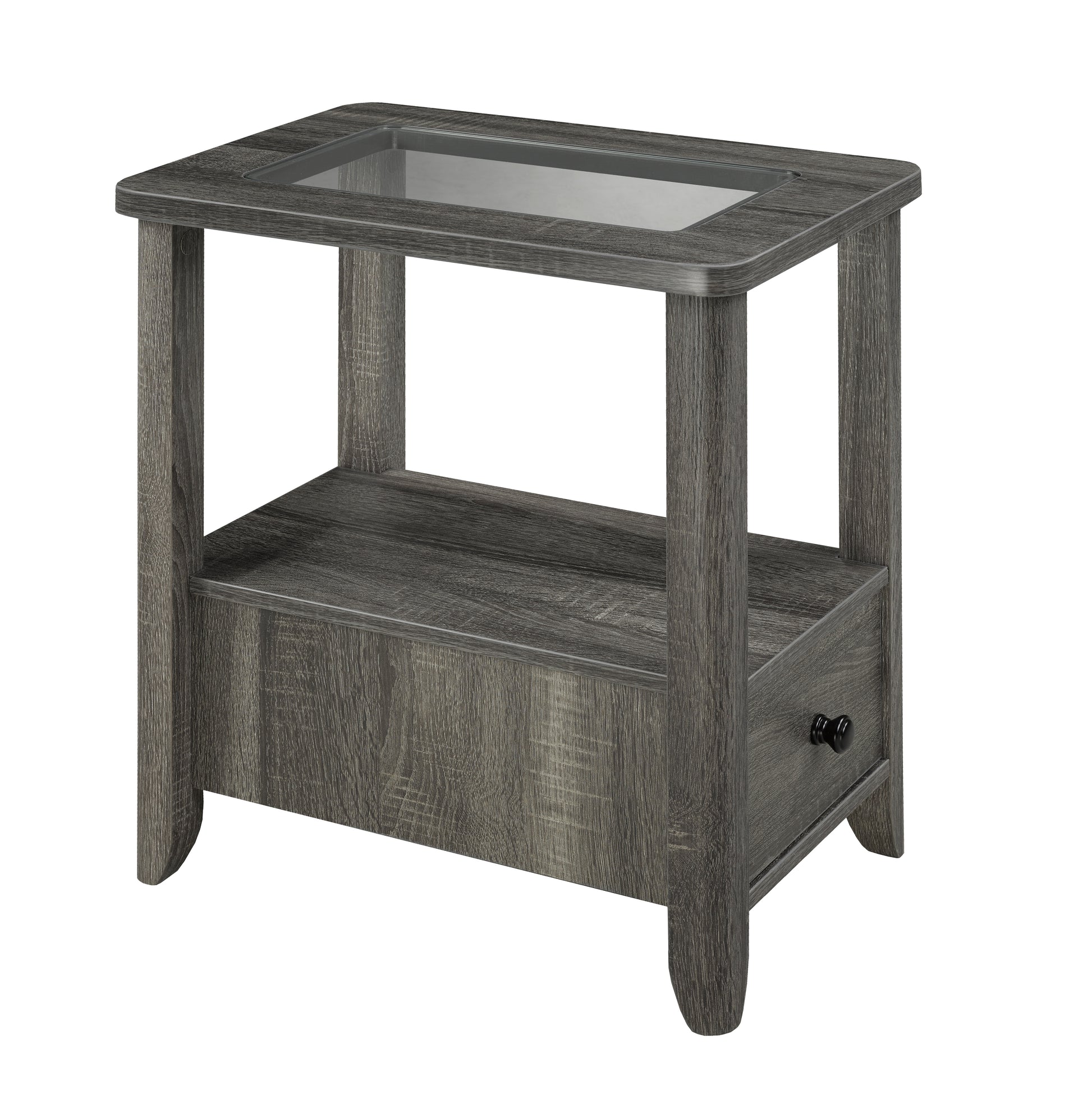 À deux niveaux, élégant mais décontracté, ce support polyvalent est polyvalent avec des possibilités illimitées ! Utilisez le dessus en verre pour votre téléphone ou vos plantes, tandis que l'étagère inférieure au fini lisse est l'endroit idéal pour les magazines ou les livres. Gardez les petits objets essentiels facilement accessibles dans le tiroir coulissant unique. La finition grise vintage et les lignes épurées se fondent bien dans presque tous les décors existants.