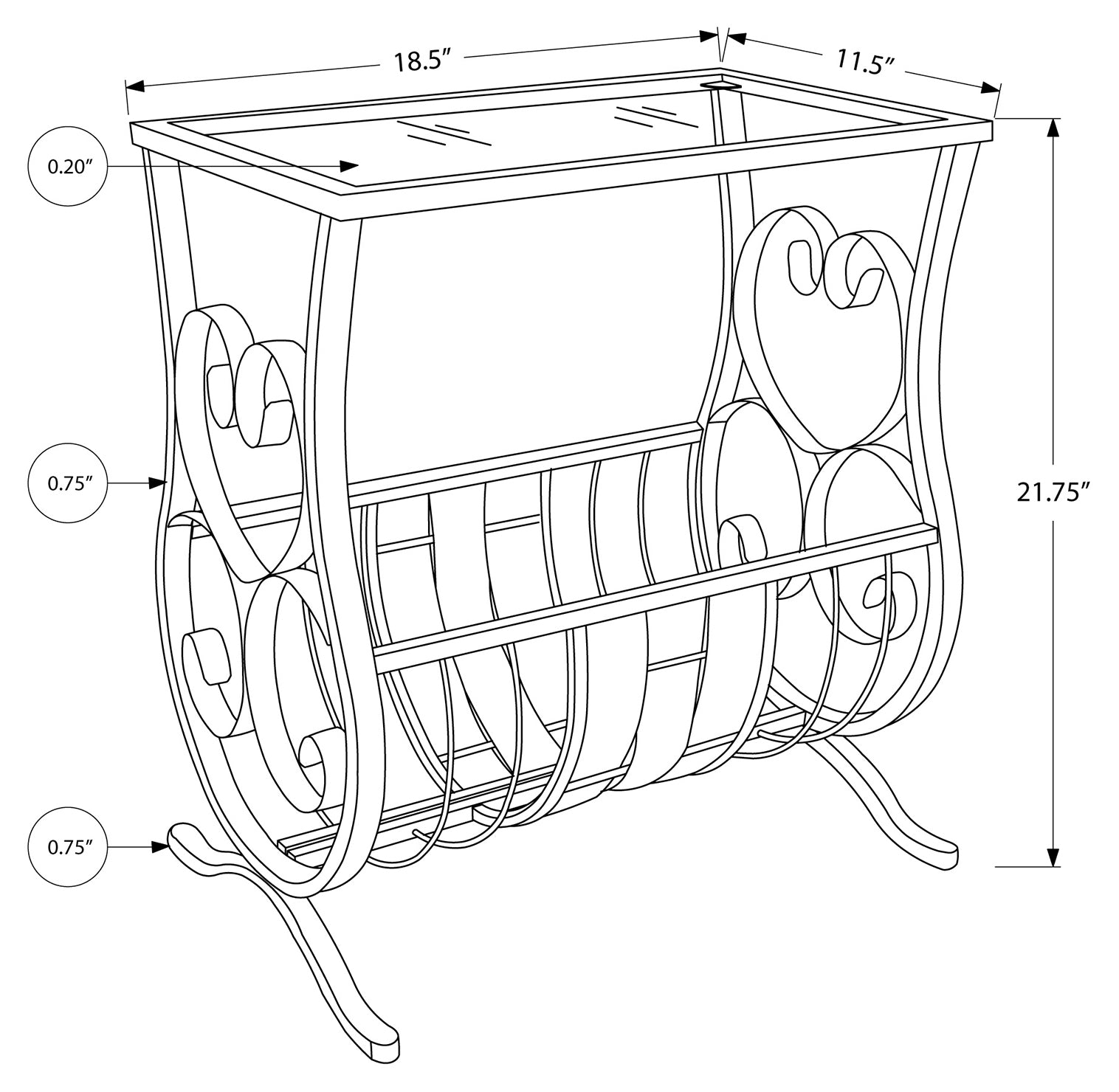 Cette élégante table de bout de magazine est à la fois élégante et multifonctionnelle. Il comprend un support en métal tissé complexe avec des barres incurvées pour contenir vos magazines ou livres et un plateau rectangulaire en verre trempé où vous pouvez placer votre tasse à café ou une lampe pendant que vous lisez le dernier roman. Finie en noir satiné, cette charmante table d'appoint est un excellent ajout à un salon, une salle familiale, un coin-détente ou une chambre à coucher.