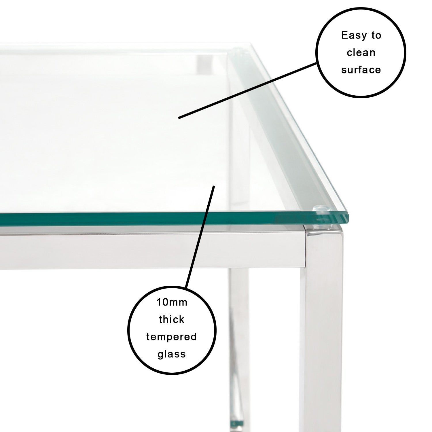 - La base de table en acier inoxydable poli avec plateau en verre trempé offre un ajout propre, distingué et raffiné à votre décoration intérieure.