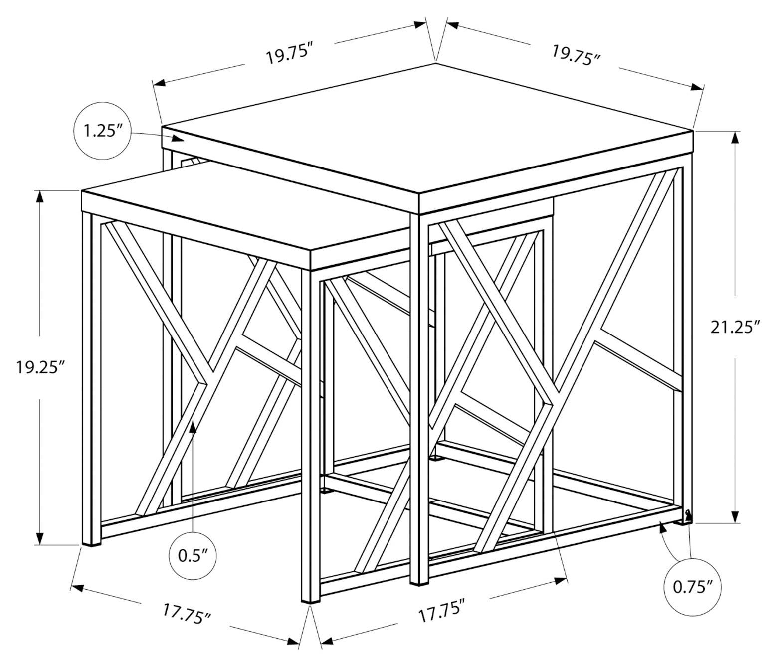 - Dimensions du produit (grande table) : 19,75"L x 19,75"l x 21,25"H ; petite table : 17,75"L x 17,75"l x 19,25"H