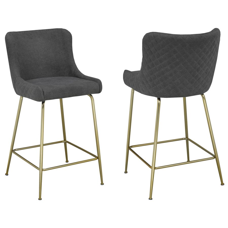 Bring the concept of an eat-in kitchen to a whole new level with this gorgeous counter stool. The soft, textured fabric upholstery is style forward with the diamond-tufted pattern on the back, and comfortable with the curved arms and cushioned seat. The sturdy metal base is finished in a matte gold that will elevate your decor status.