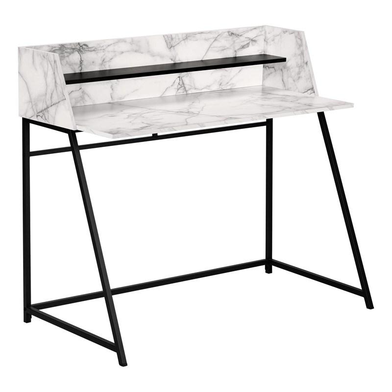 Regardez votre bureau à domicile sous un angle différent avec ce bureau d'ordinateur doté d'une huche de rangement. Fini dans un stratifié d'aspect marbre blanc, le bureau compact a des panneaux latéraux qui s'inclinent pour s'aligner parfaitement avec les pieds métalliques attrayants de forme trapézoïdale pour un look épuré. La huche comprend 1 longue étagère dans une finition noire contrastante qui est la taille idéale pour contenir de petits objets comme des haut-parleurs sans fil ou un bloc de notes autocollantes. Le bureau est soutenu par une base métallique robuste en noir avec une barre de support à l'arrière parallèle à l'étagère. Cet ordinateur portable ou table d'écriture contemporain au design peu encombrant est un excellent choix si vous utilisez votre salon ou votre chambre comme bureau à domicile.
