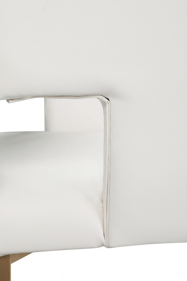 Ajoutez la chaise de salle à manger en similicuir blanc Caleb à votre salle à manger pour un confort et un style ultimes. Cette chaise a une assise carrée et un dossier bas ouvert en bas vers l'arrière et sur les côtés. Quatre pieds carrés en fer doré brossé offrent soutien et stabilité, tandis que le velours doux et le rembourrage de la chaise offrent un air de luxe. Plusieurs tables disponibles complètent parfaitement cette pièce contemporaine.